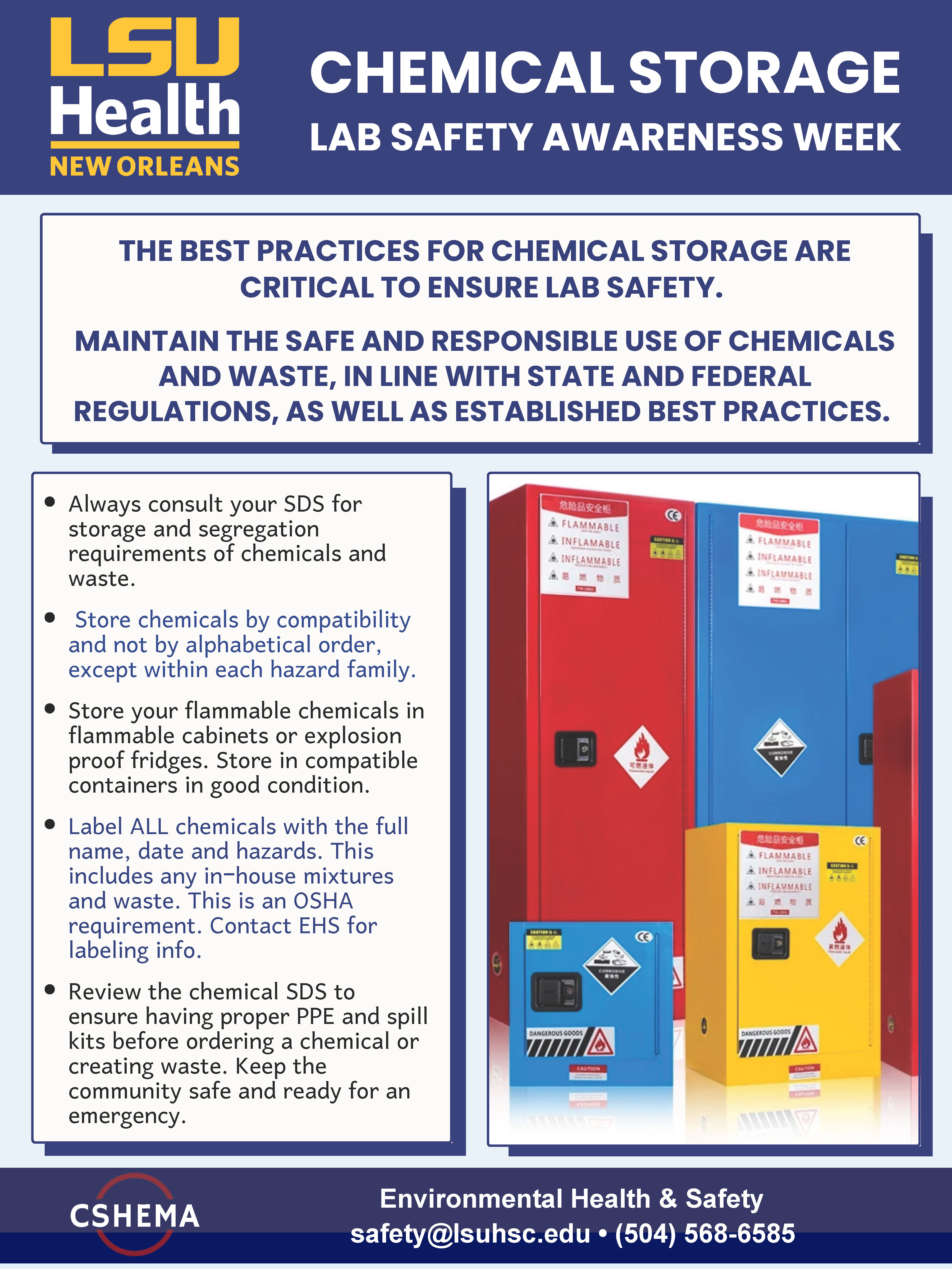 Environmental Health and Safety (EH&S) again joins the Campus Safety, Health, and Environmental Management Association (CSHEMA) and academic institutions nationwide in recognizing Lab Safety Awareness Week.  This week is dedicated to acknowledging the accomplishments of laboratory safety programs and providing awareness of program policies, procedures, and other valuable resources available to help ensure the safety of faculty, staff, and students during laboratory research activities.