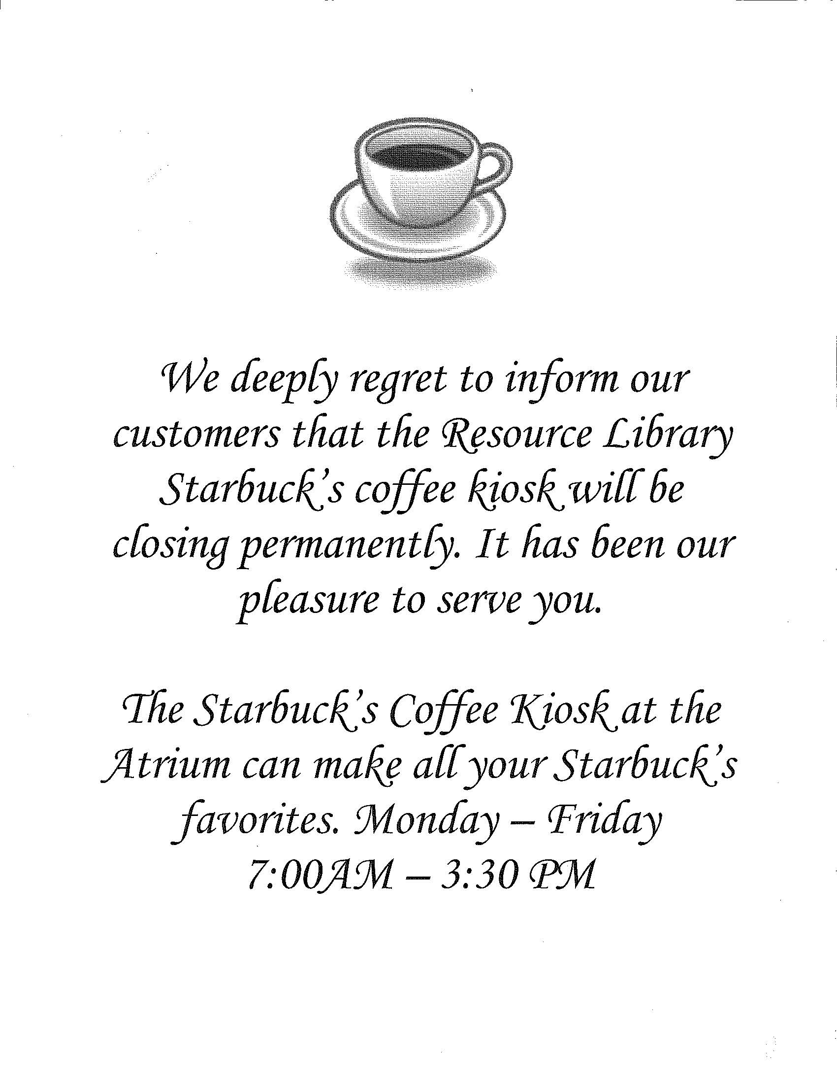 The last official day to buy Starbucks coffee and other goodies from the kiosk in the Resource Center building is today March 28th. The coffee kiosk in the atrium will remain open during their normal hours. There will be a few small changes in the cafeteria until an agreement in the food service department is reached.