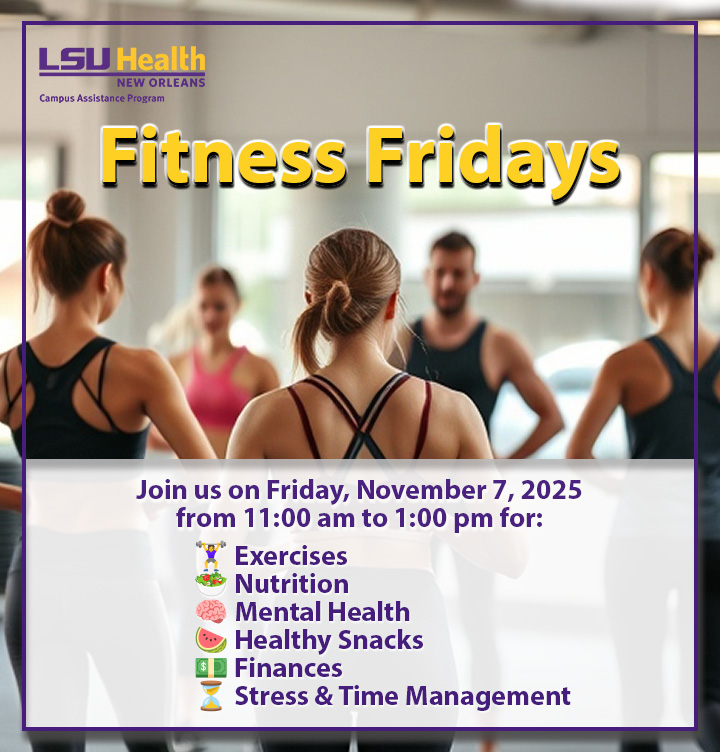 Join Fitness Fridays every first Friday of the month at the LSUHSC Wellness Center. Next time: November 7th from 7:00 am to 9:00 am.