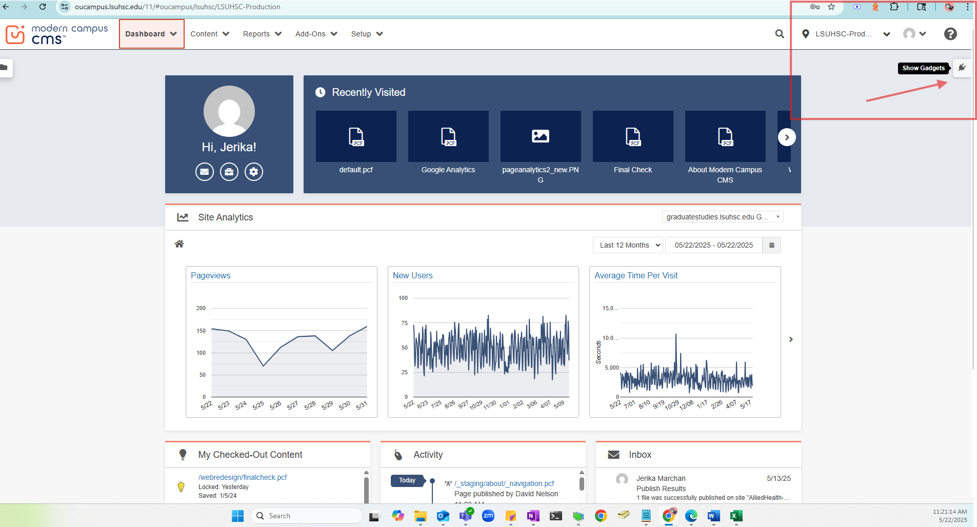 Modern Campus CMS offers two different Gadget options that pull in Google Analytics data: Page analytics and Site Analytics.